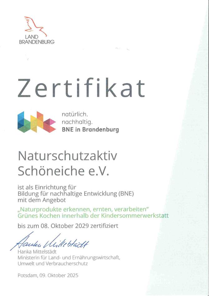 Seit 2021 werden im Kleinen Spreewaldpark Outdoor-Formate nach dem Konzept der Bildung für nachhaltige Entwicklung (BNE) angeboten. Die Angebote sind gruppenspezifisch auf die jeweilige Alterstufen (KiTa/Vorschulkinder, Grundschüler und Sekundarstufe I) zugeschnitten und gehen in der Regel von 1,5 bis 3 h. Für individuelle Projektplanung zu Thementagen (Wasser-/ Müllproblematik, Klimafolgen oder Igel, Biber, Eichhörnchen), Teamtagen und Wandertagen können auch längere Formate angeboten werden.